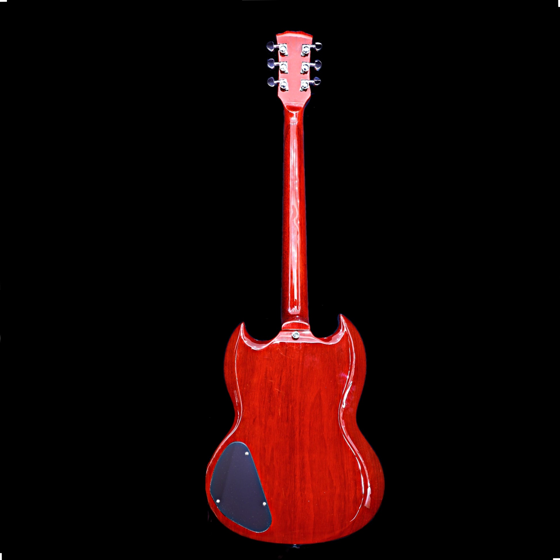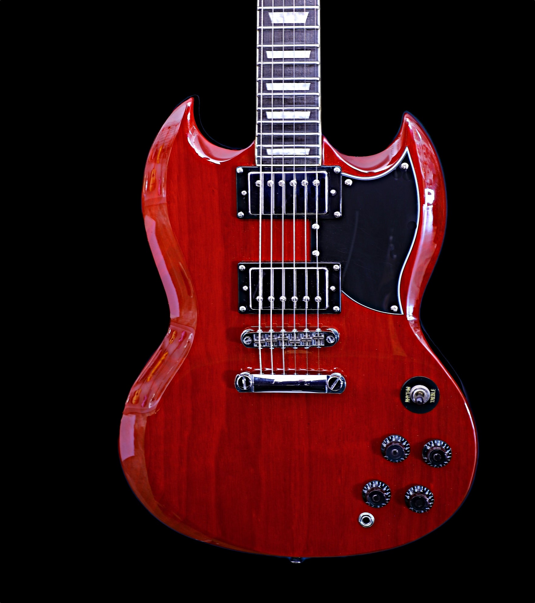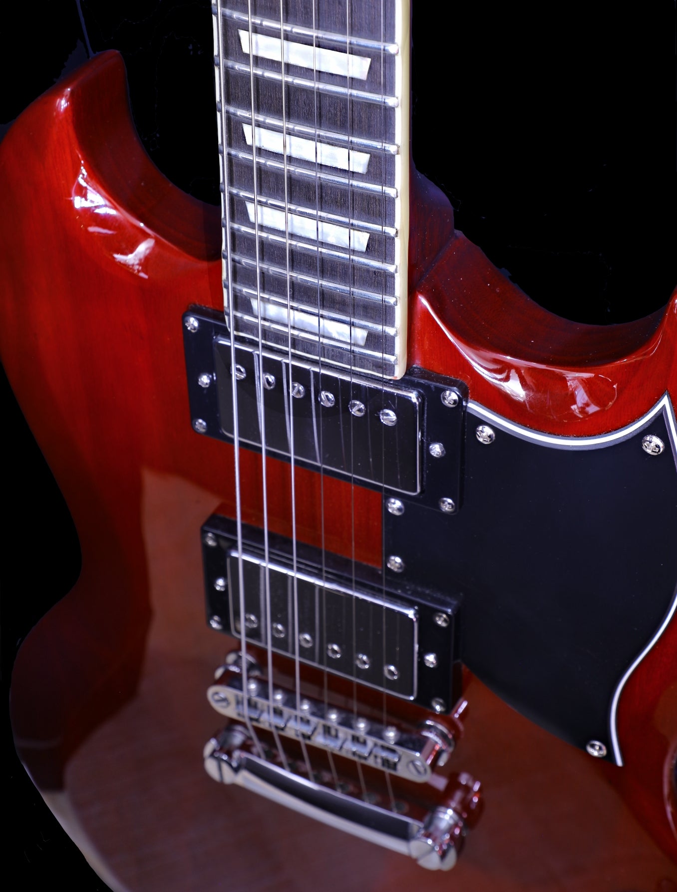 The Angus offers a Mahogany neck and body in a translucent cherry red finish.
