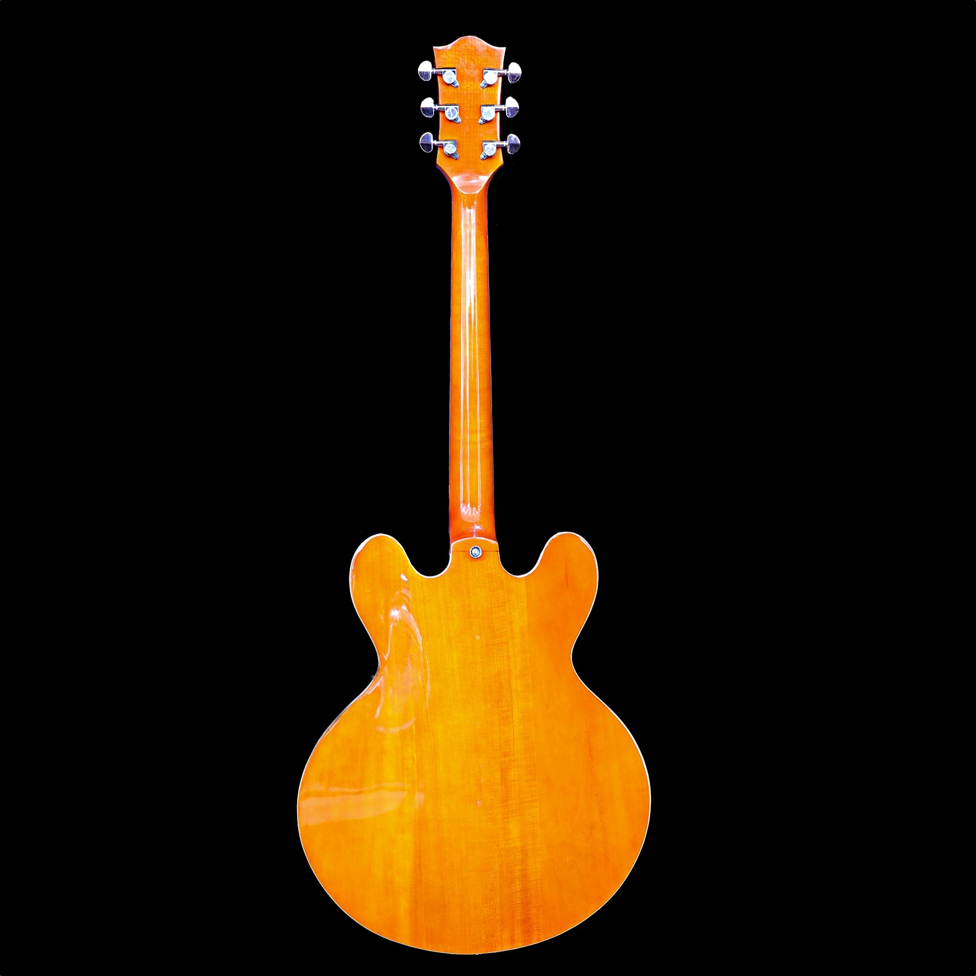 The body and fretboard feature vintage ivory coloured binding that is offset by Arctic White “f” hole lining.