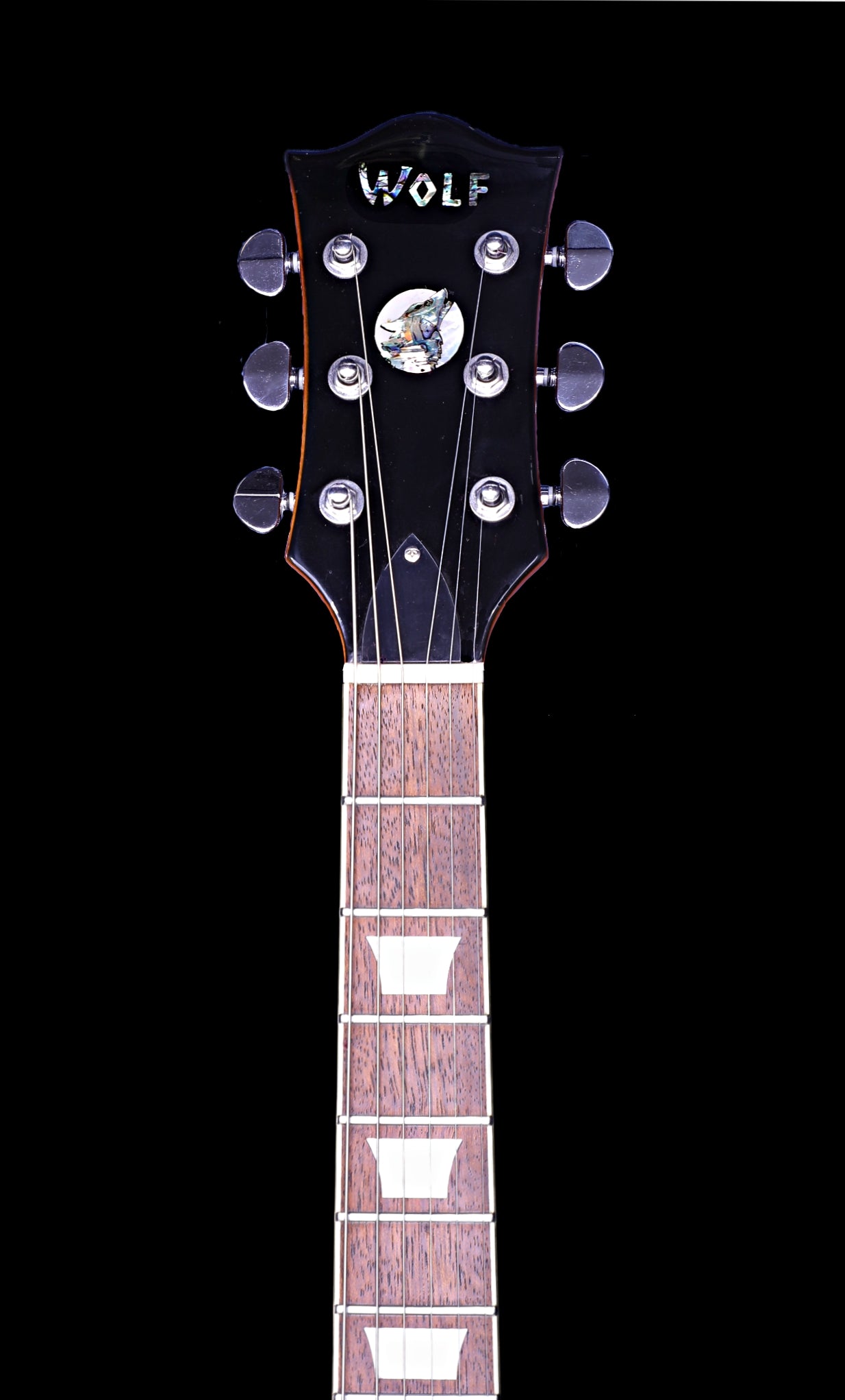 Trapezoid Mother of Pearl fretboard markers lead up to a striking Abalone and Mother of Pearl Wolf headstock logo.