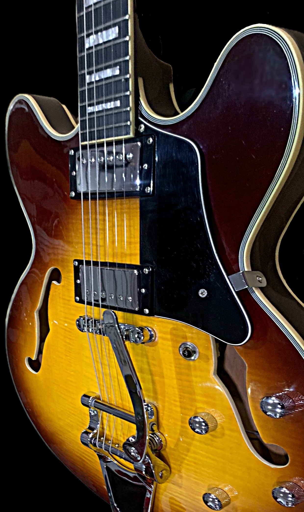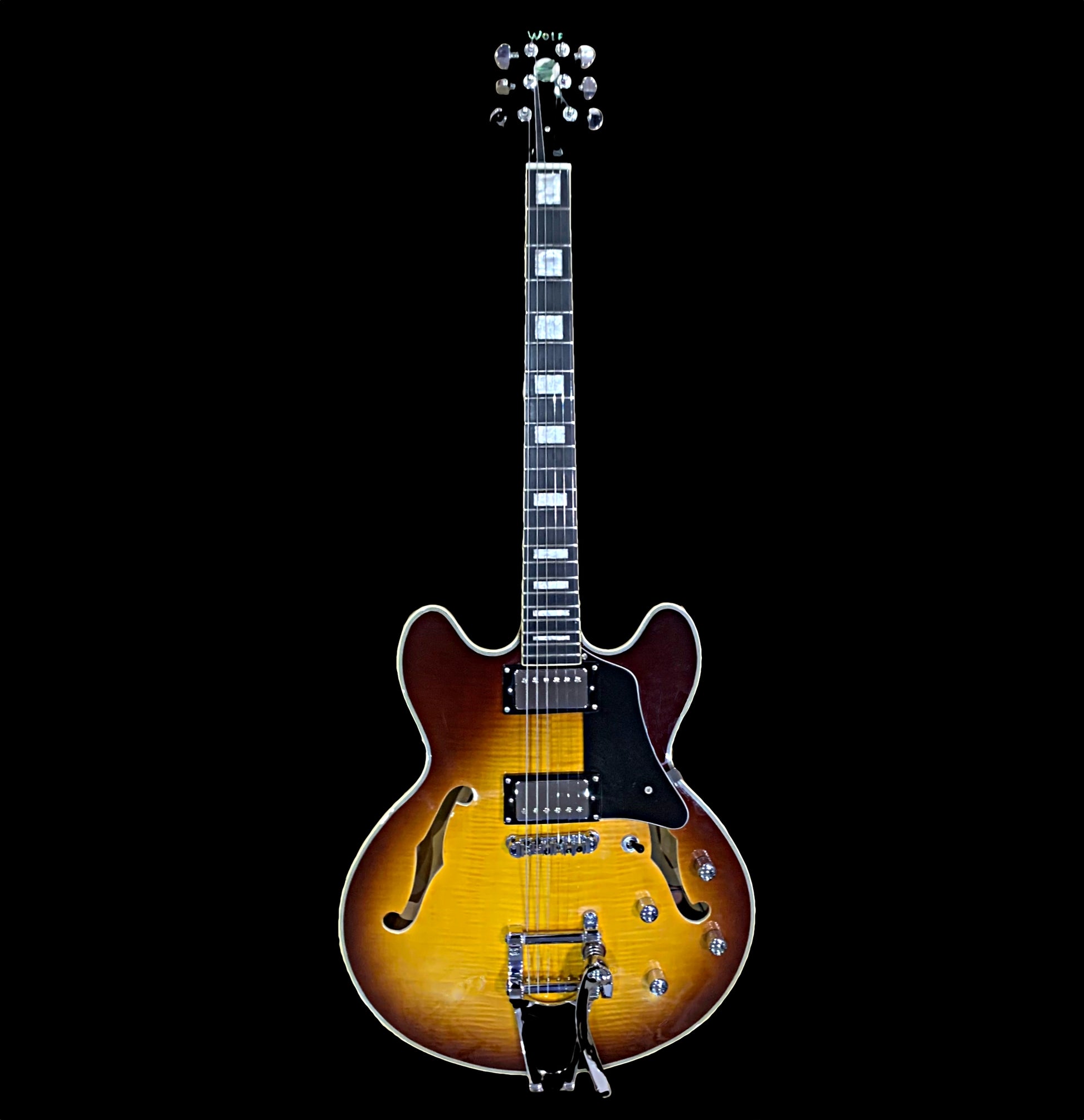 The Wolf Heritage Series G-Dawg is a semi-hollow double cut away workhorse which is capable of creating many tones for any style of music. This machine comes with a Mahogany neck and core, basswood body, flame maple veneer and triple binding.