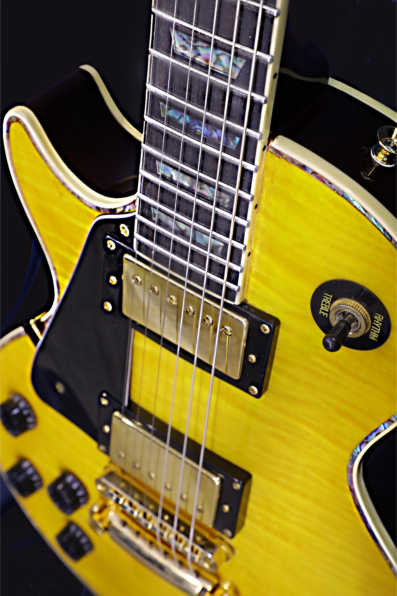 Featuring gold hardware, overwound extra hot custom Howlin-Wolf Humbuckers, 3-way selector, dual volume and tone controls.