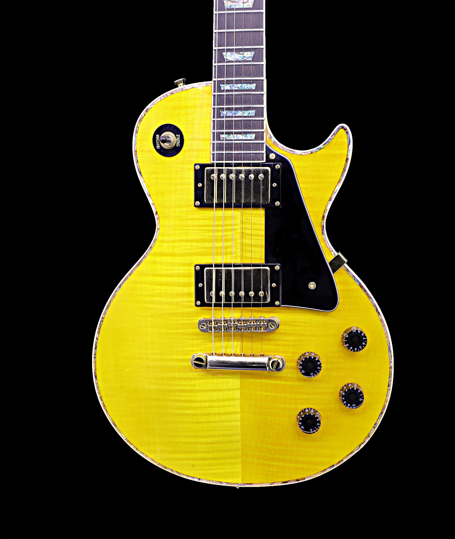 Mahogany neck and body with flame maple veneer with striking abalone binding.