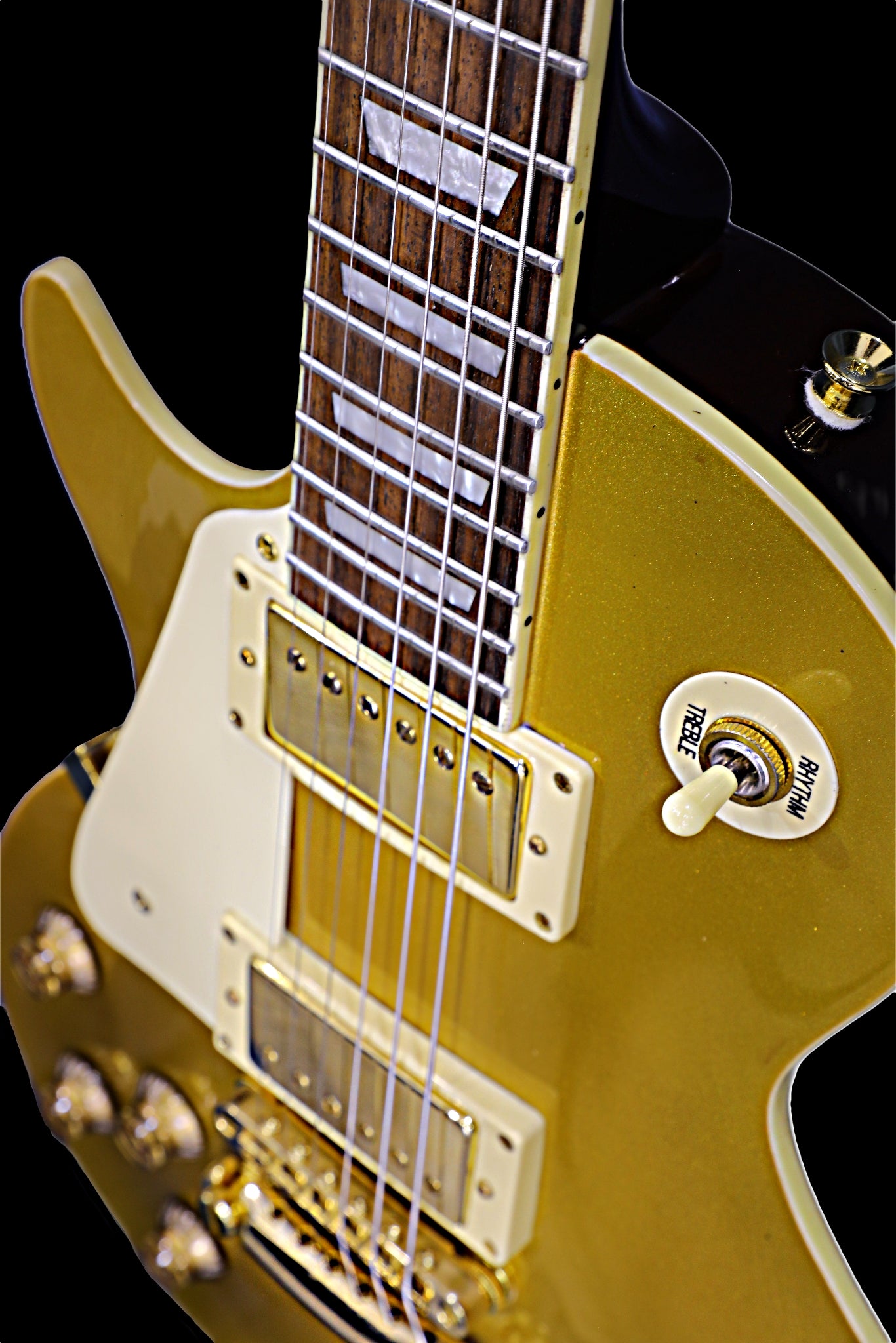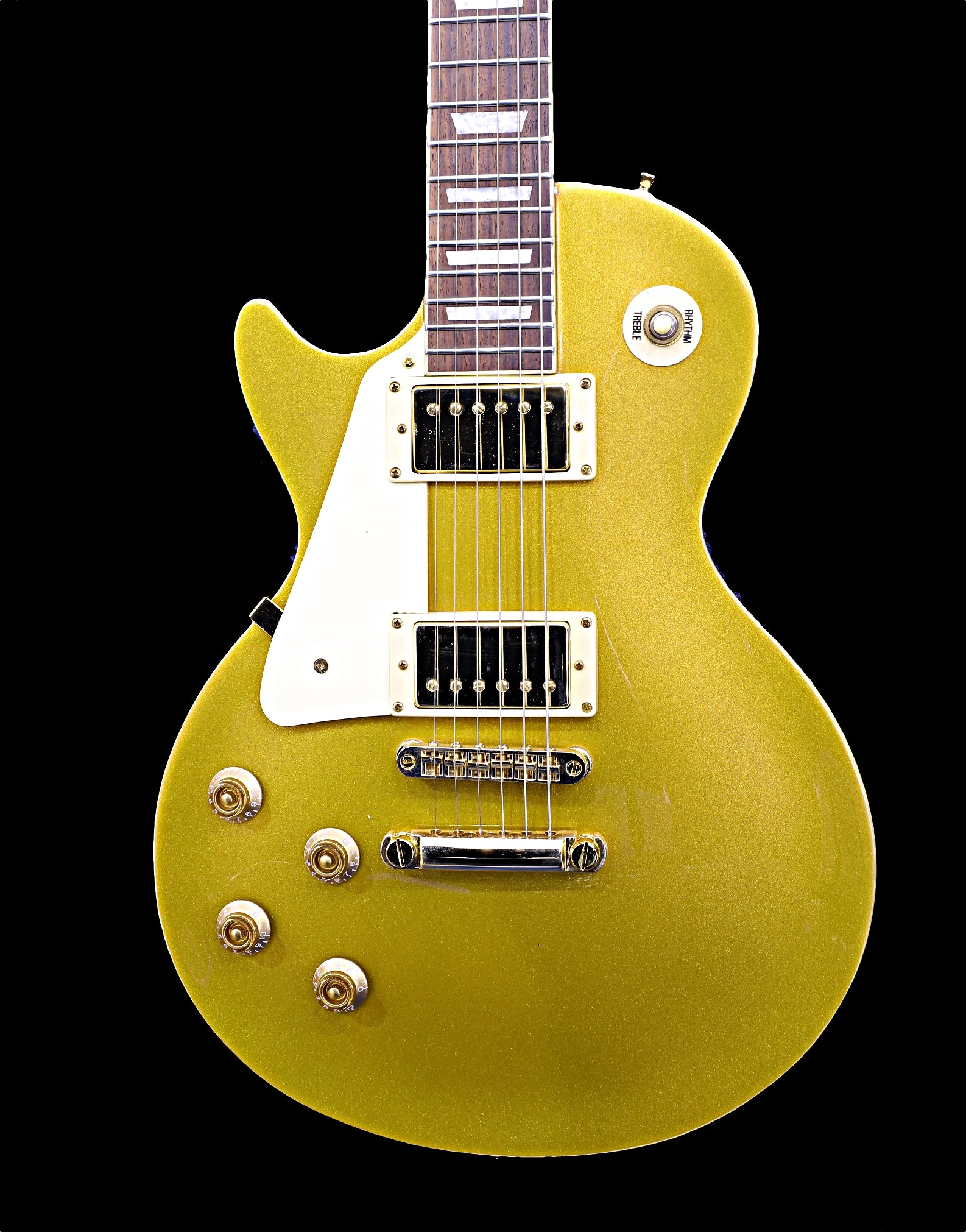 Featuring gold hardware, overwound extra hot custom Howlin-Wolf Humbuckers, 3-way selector, dual volume and tone controls.