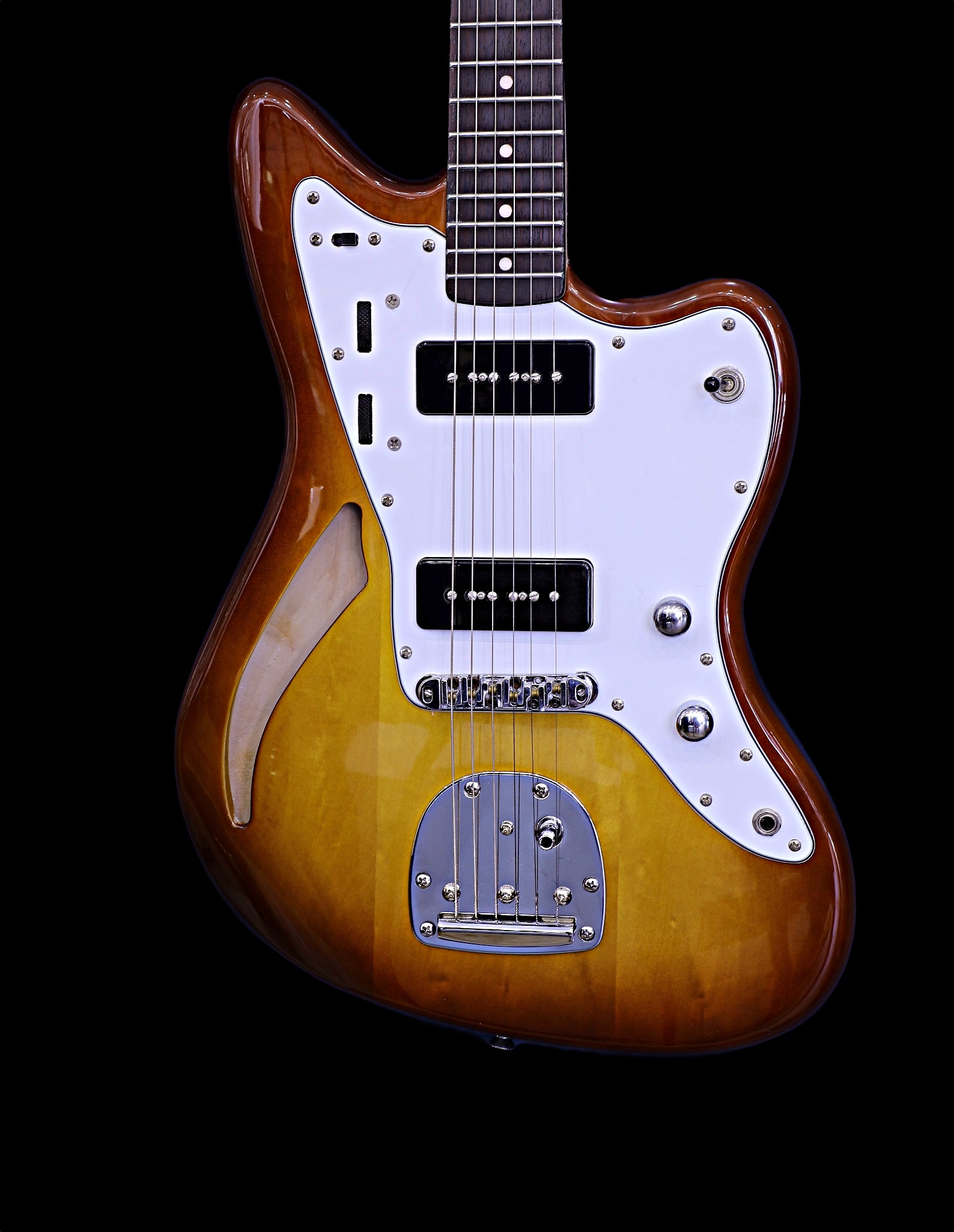 A Chambered Jazz/Surf Style Electric Guitar finished in striking Tobacco Sunburst.