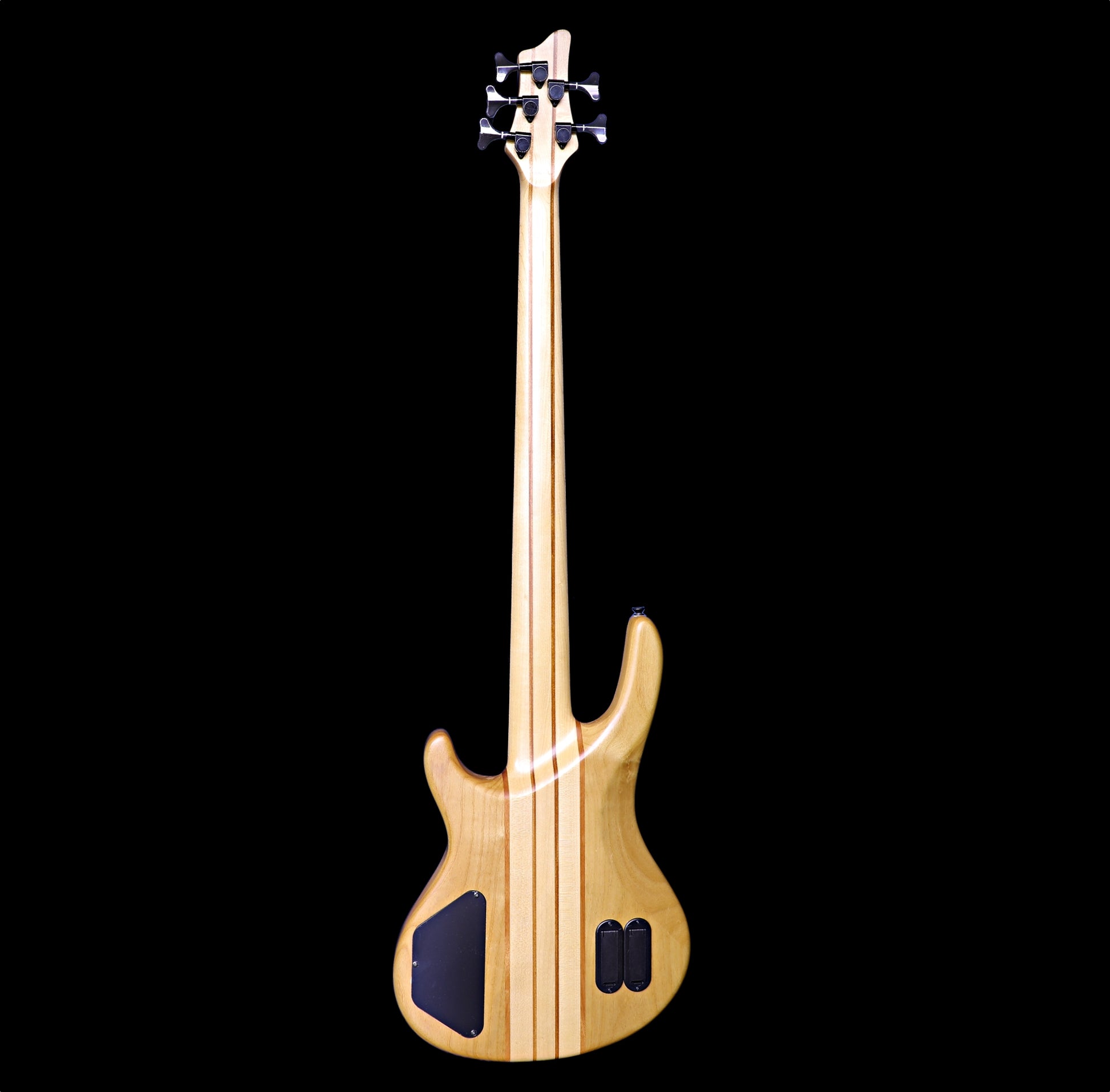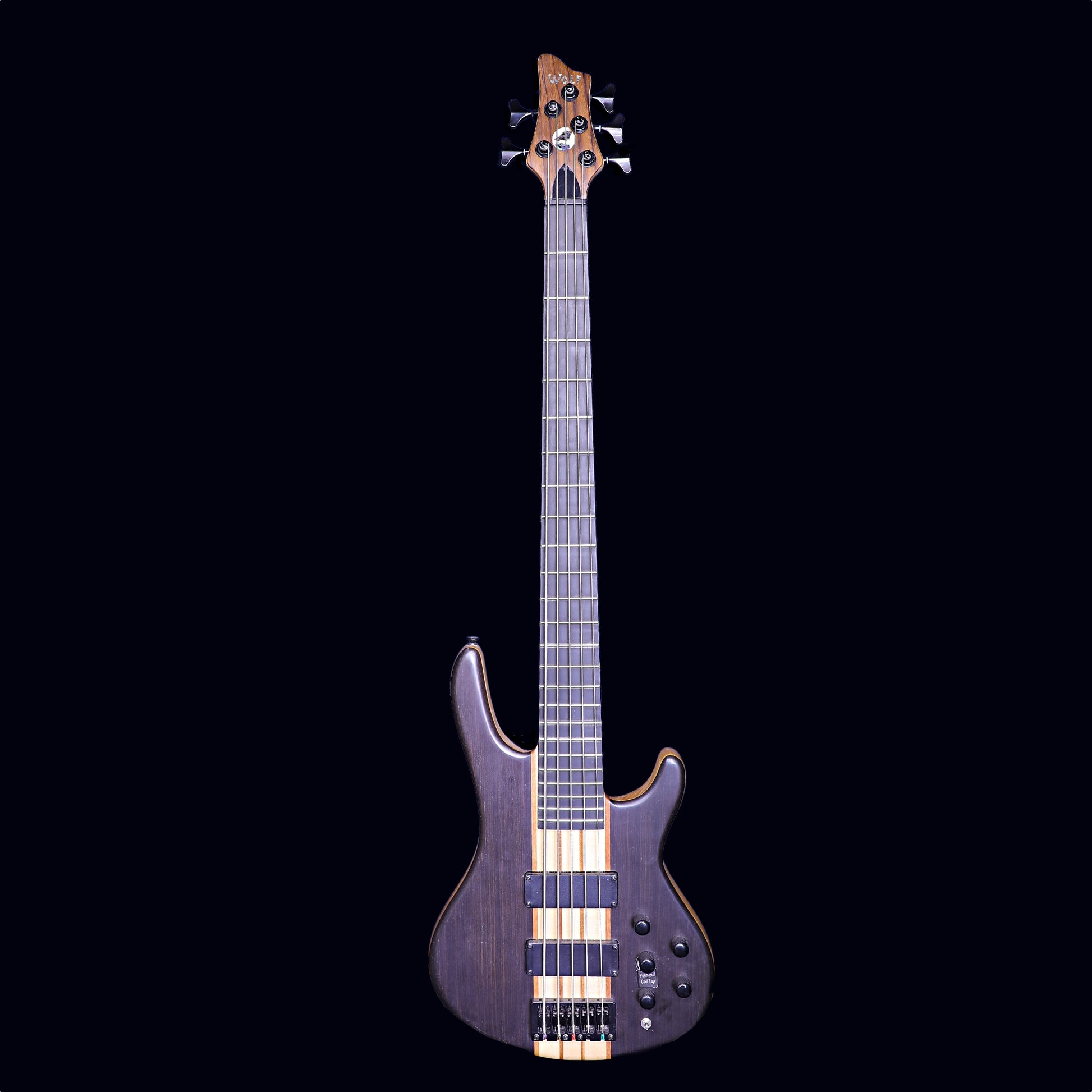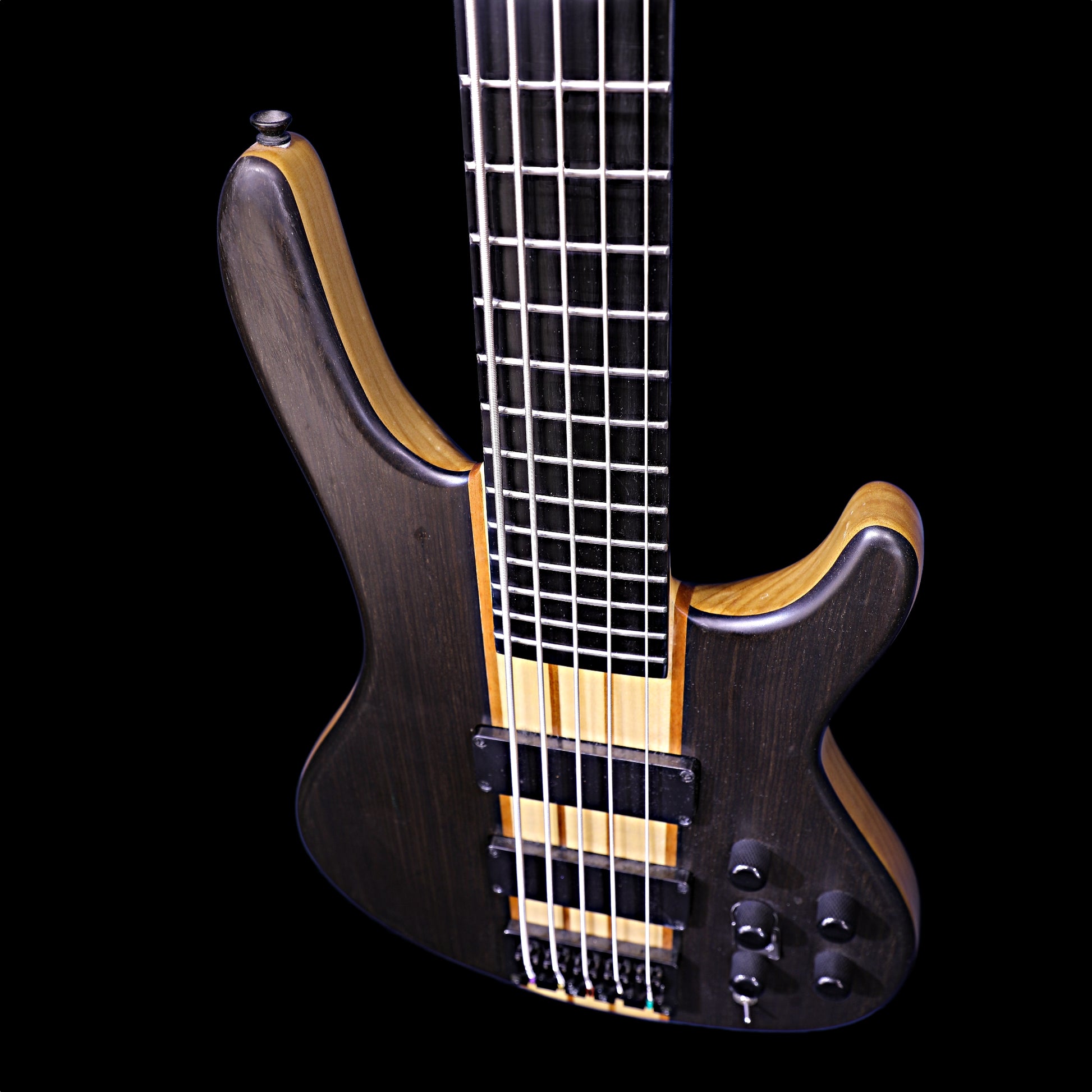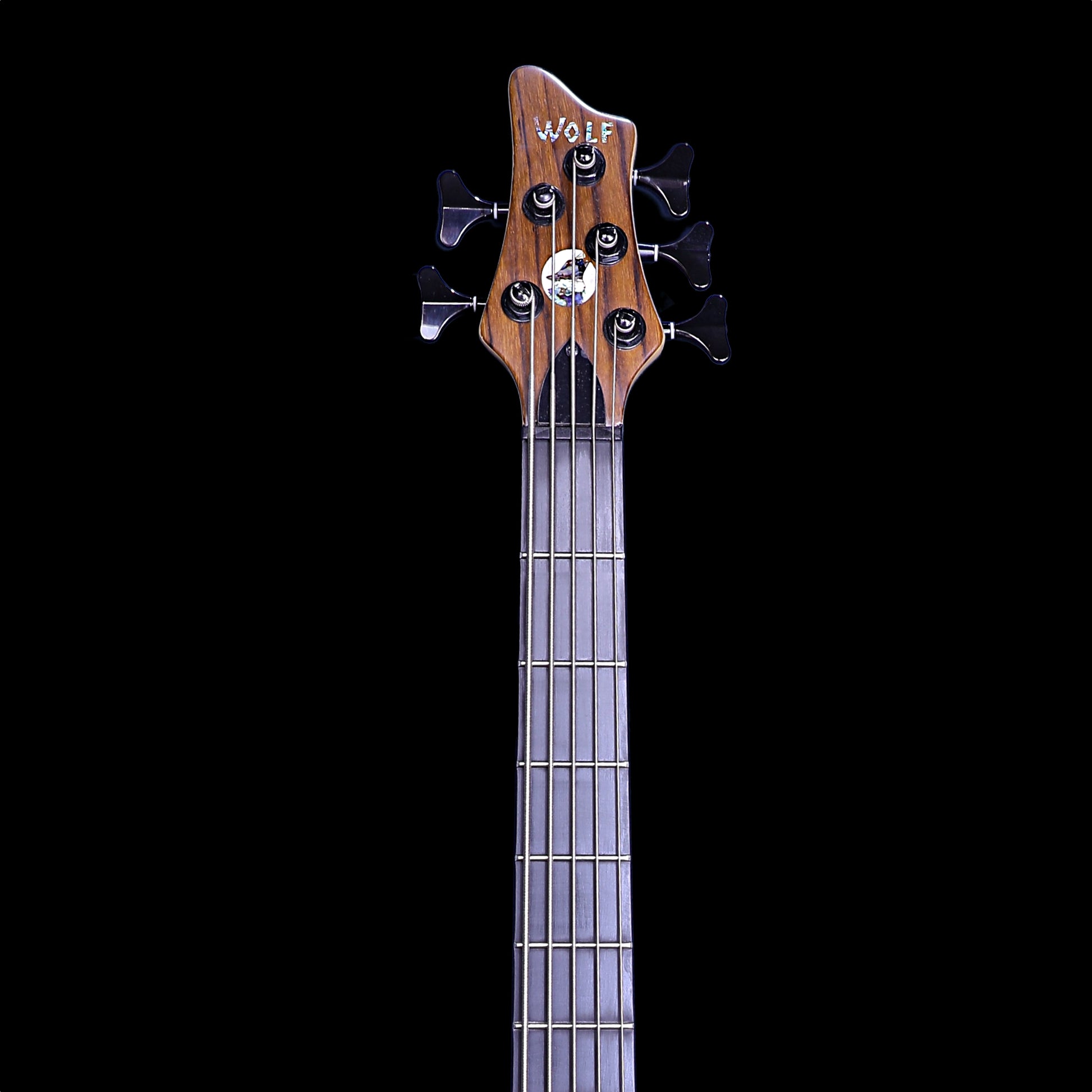 The Wildwood 5 has a modern neck-through-body construction with an ergonomically shaped Asian Nato Heartwood body and a rosewood cap. The five piece Nato and Maple neck offers 24 frets on an Ebony fingerboard with Custom Wolf Tuners for added tone and stability.